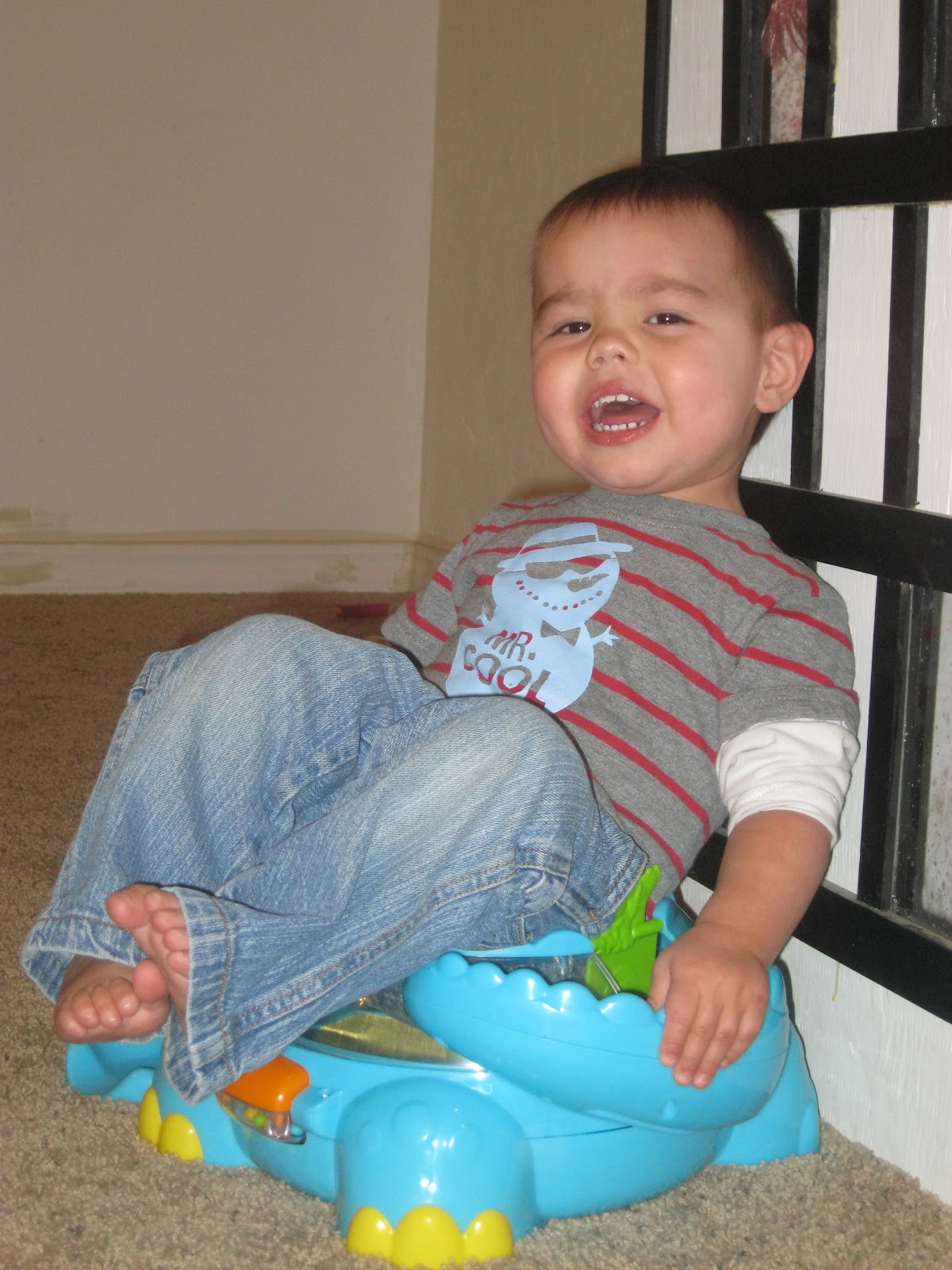 The boys got that alligator ball popper for Christmas and they have really enjoyed it. We started hearing Tyler get a little fussy so we checked on him and saw this: